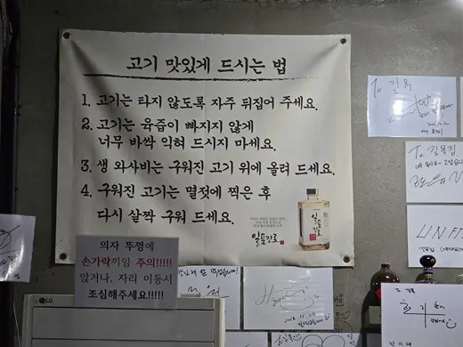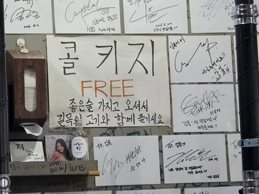 콜키지 프리 가능 문구와 유명한 분들 사인 가득한 벽면