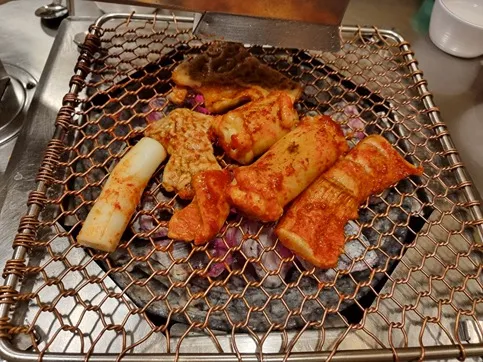 석쇠에 올려진 모둠구이 의 대창, 막창, 특양과 그리고 가래떡
