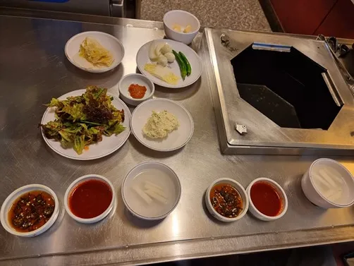 기본상차림 - 상추겉절이, 오이무침, 감자샐러드,백김치, 순두부찌개, 찍어 먹는 소스 3종류