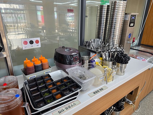 소스 그릇에 담겨 있는 소스와 추가 육수 볶음밥 재료 등이 준비되어 있다.