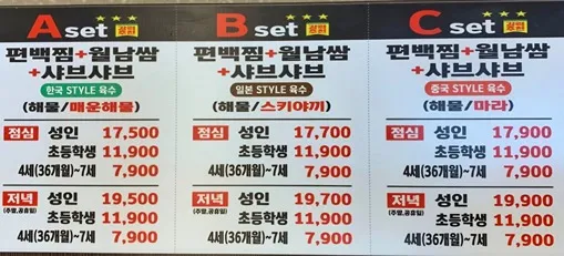 샤브샤브 세 가지 세트 메뉴가 기본 해물 육수에 매운 해물, 스키야끼, 마라 육수중 원하는 국물의 세트를 선택할 수 있다.