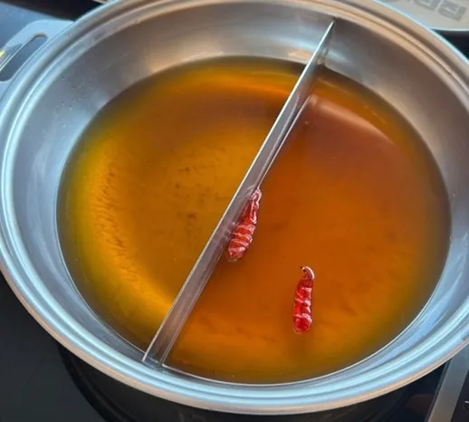해물육수 와 매운 해물 육수로 된 A세트 육수 매운 해물 육수는 많이 맵지는 않고 칼칼한 맛만 있다.